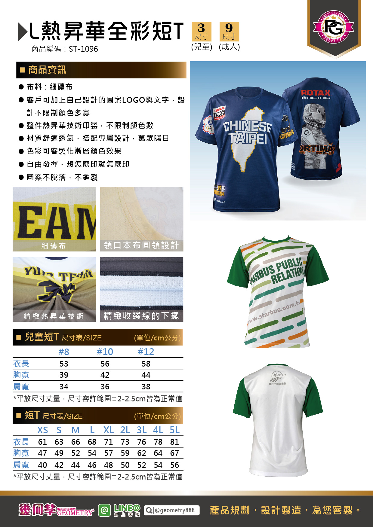 品名: ST-1096-L熱昇華全彩連帽短T 編號: ST-1096 布料: 細磚布 特點: 1.一體成形,圖案不脫落,不龜裂 2.整件可滿版熱昇華技術印製,不限制顏色數 3.材質舒適透氣,搭配專屬設計,萬眾矚目 4.實際製作可能與螢幕色有10~15%的色差 尺寸: 兒童: #8~#12 成人: XS~5L 適用於班服/系服/社服/團服/制服/工作服/展場活動服/家族服/團體服