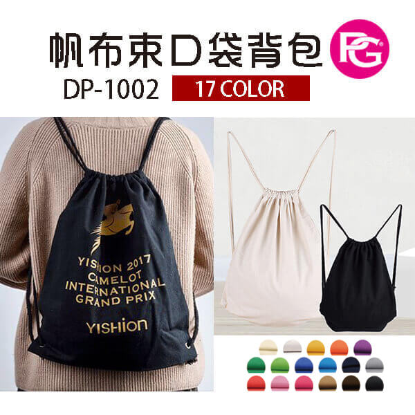 品名 : DP-1002-帆布束口袋背包 編號: DP-1002 材質:帆布+棉質揹繩 顏色:本色/黑/白色/中黃/橘紅/紫/草綠/黃綠/寶藍/湖藍/藏青/中灰/大紅/粉紅/玫紅/卡其/咖啡 布色:17色 特點: 1.中容量 2.攜帶方便 3.可單面印圖文 公版尺寸 : 寬34高40公分 (*手工製作難免有1~2公分誤差,屬於正常範圍) 適合:客製禮品/活動贈品/畢業禮物/束口袋訂製/客製背包/客製帆布包/帆布束口袋