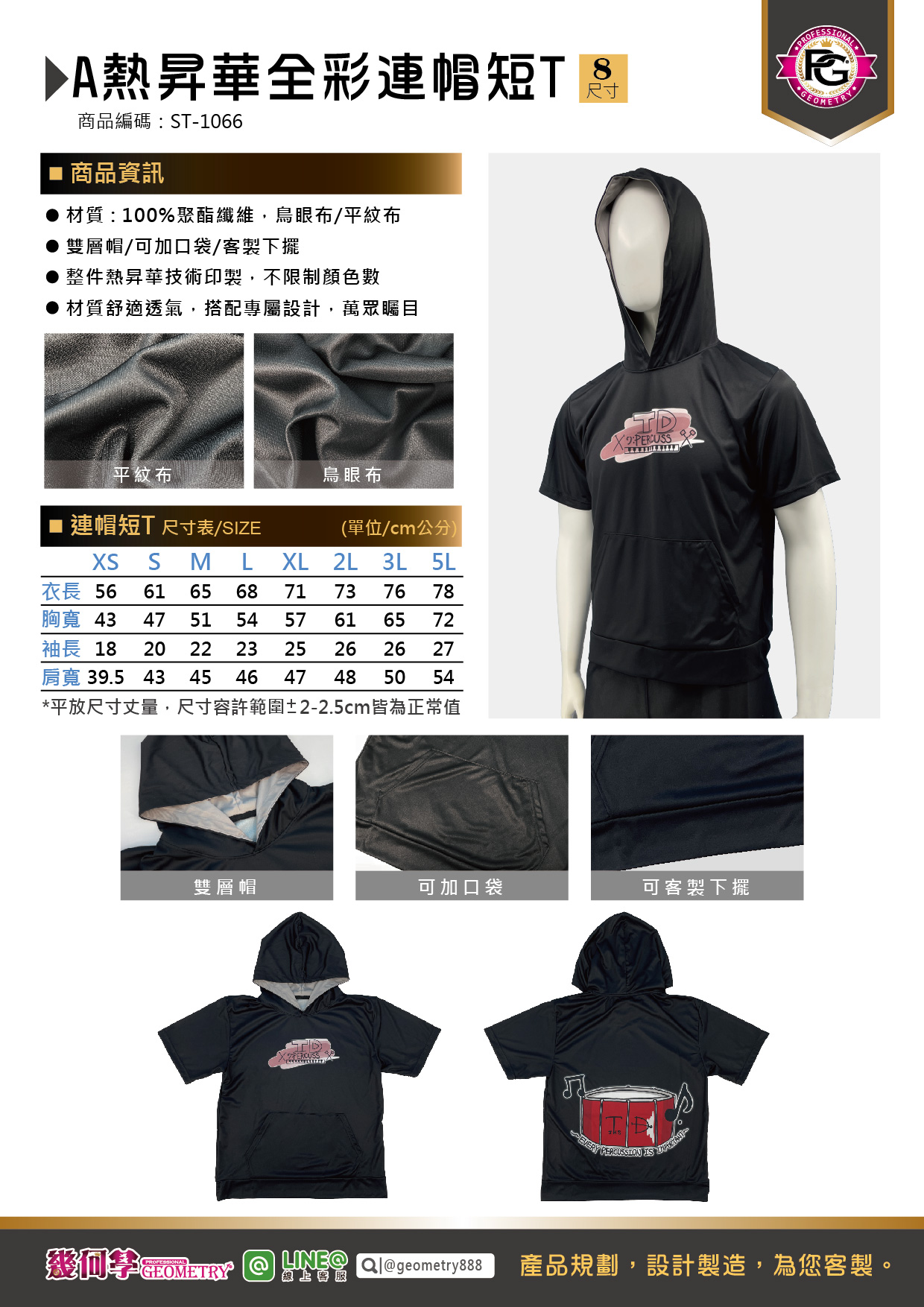 品名: ST-1066-A熱昇華全彩連帽短T 編號: ST-1066 材質: 100%聚酯纖維,鳥眼布/平紋布 特點: 1.雙層帽/可加口袋/客製下擺 2.整件熱昇華技術印製,不限制顏色數 3.材質舒適透氣,搭配專屬設計,萬眾矚目 4.實際製作可能與螢幕色有10~15%的色差 尺寸:XS~5L 適用於班服/系服/社服/團服/制服/工作服/展場活動服/家族服/團體服