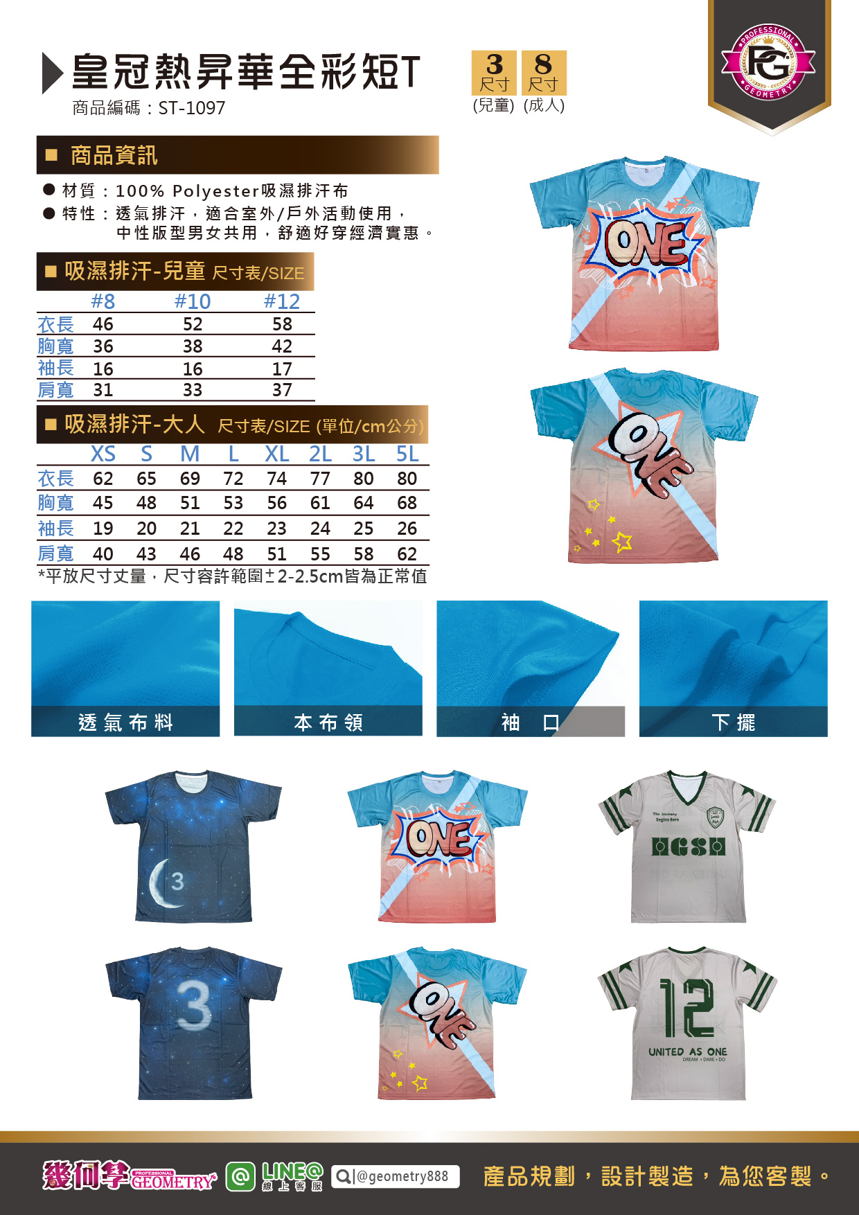 品名: ST-1097-皇冠熱昇華全彩連帽短T 編號: ST-1097 布料: 克重140 碼重240-250 100%polyester 特點: 1.一體成形,圖案不脫落,不龜裂 2.整件可滿版熱昇華技術印製,不限制顏色數 3.材質舒適透氣,搭配專屬設計,萬眾矚目 4.實際製作可能與螢幕色有10~15%的色差 尺寸: 兒童: #8~#12 成人: XS~5L(無4L) 適用於班服/系服/社服/團服/制服/工作服/展場活動服/家族服/團體服