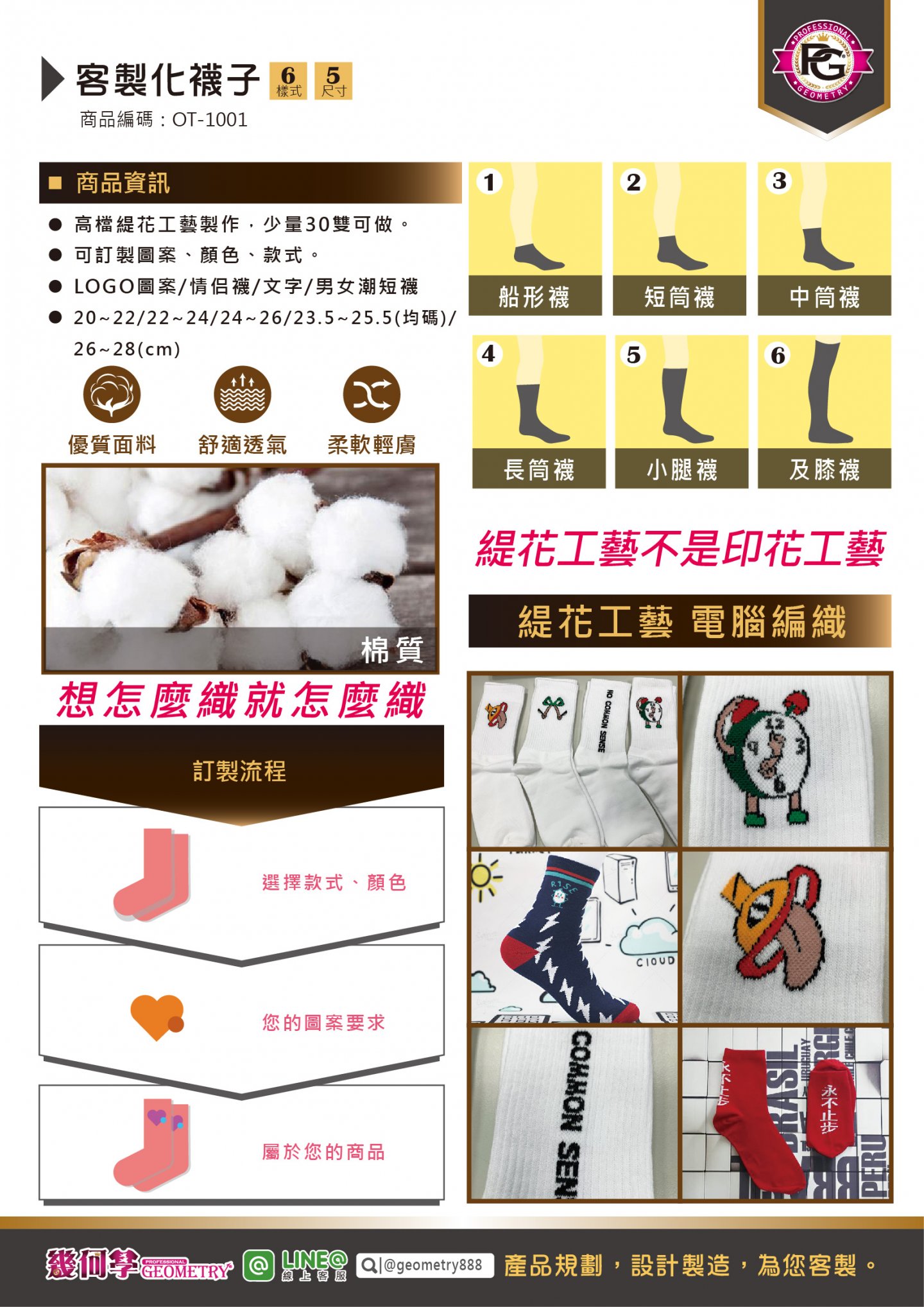 品名: OT-1001-客製化襪子 材質:棉質 顏色:全彩/單色皆可 6種款式:船形/短筒/中筒/長筒/及膝/小腿襪 尺寸: 20-22/22-24/24-26/均碼23.5-25.5(cm)/26-28 商品特點: 1.高檔緹花工藝製作,起訂量30雙 2.可客製圖案、顏色 3.顏色鮮豔,舒適透氣,讓收禮的人襪襪叫,充滿驚喜! 適用於客製禮贈品/獨特紀念品/文創小物/活動小物等