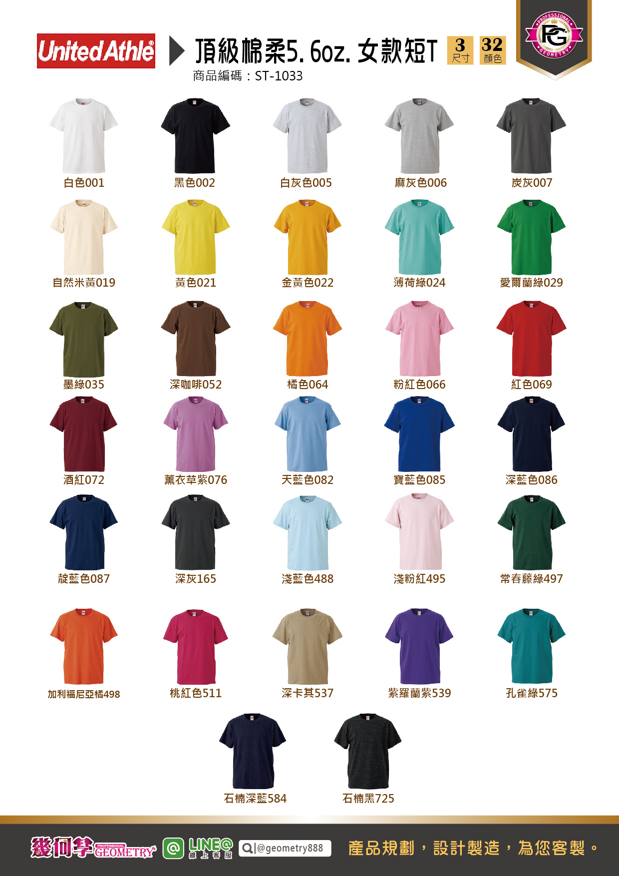 白/白灰/麻灰/炭灰/深灰/石楠黑/黑/自然米黃/深卡其/黃/金黃/橘/加利福尼亞橘/淺粉紅/粉紅/桃紅/紅/酒紅/深咖啡/薄荷綠/孔雀綠/愛爾蘭綠/常春藤綠/墨綠/淺藍/天藍/寶藍/靛青/深藍/石楠深藍/薰衣草紫/紫羅蘭紫